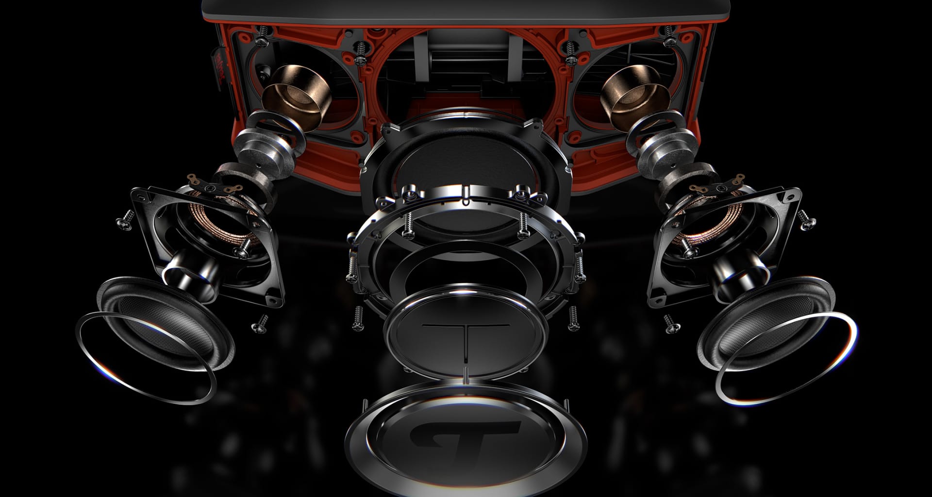 Wide-band driver made of aluminum for stable volume levels Passive radiator for deep bass Integrated class-D amplifier for distortion-free playback at any volume