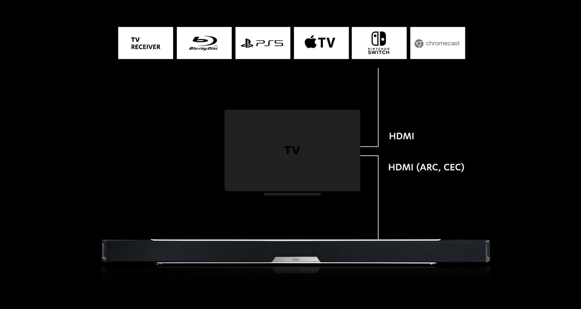 Connect it to your TV with a single HDMI cable. Then plug your device into the TV for brilliant sound.