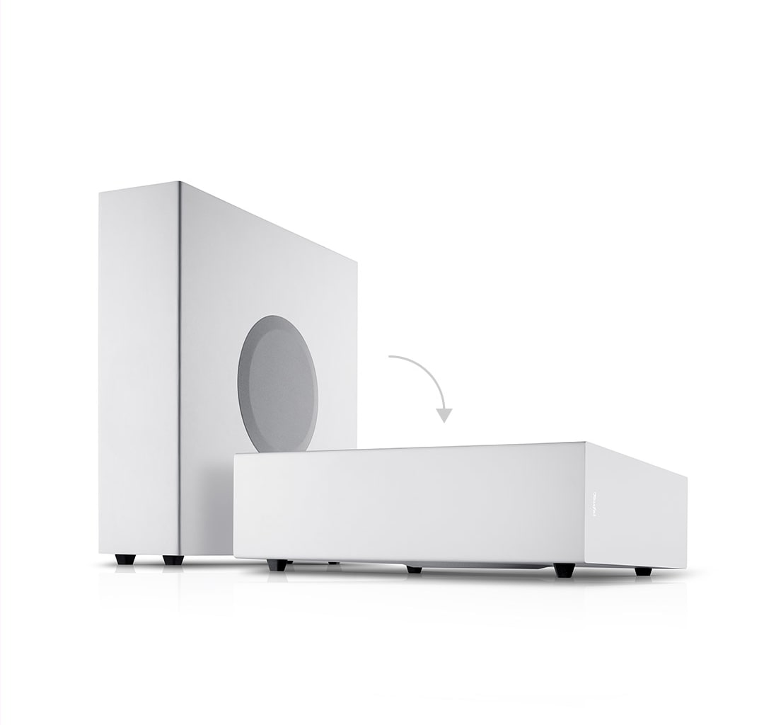 • Innovative, space-saving T 6 subwoofer for deep, precise kick bass, can be placed horizontally (under the sofa) or vertically, sound image can be adapted to the set-up.