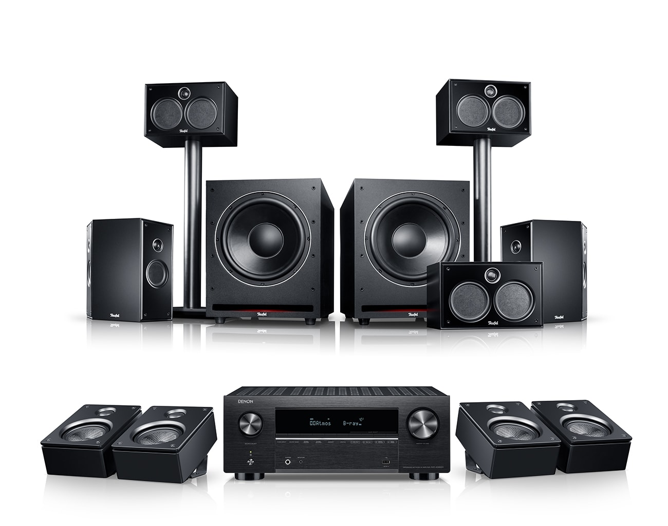• Contents of the complete set: 2 x System 6 front speakers, centre, subwoofer, 2 x rear speakers, Denon AV receiver AVC-X3800H, 2 pairs of Reflekt Dolby Atmos speakers, cable set