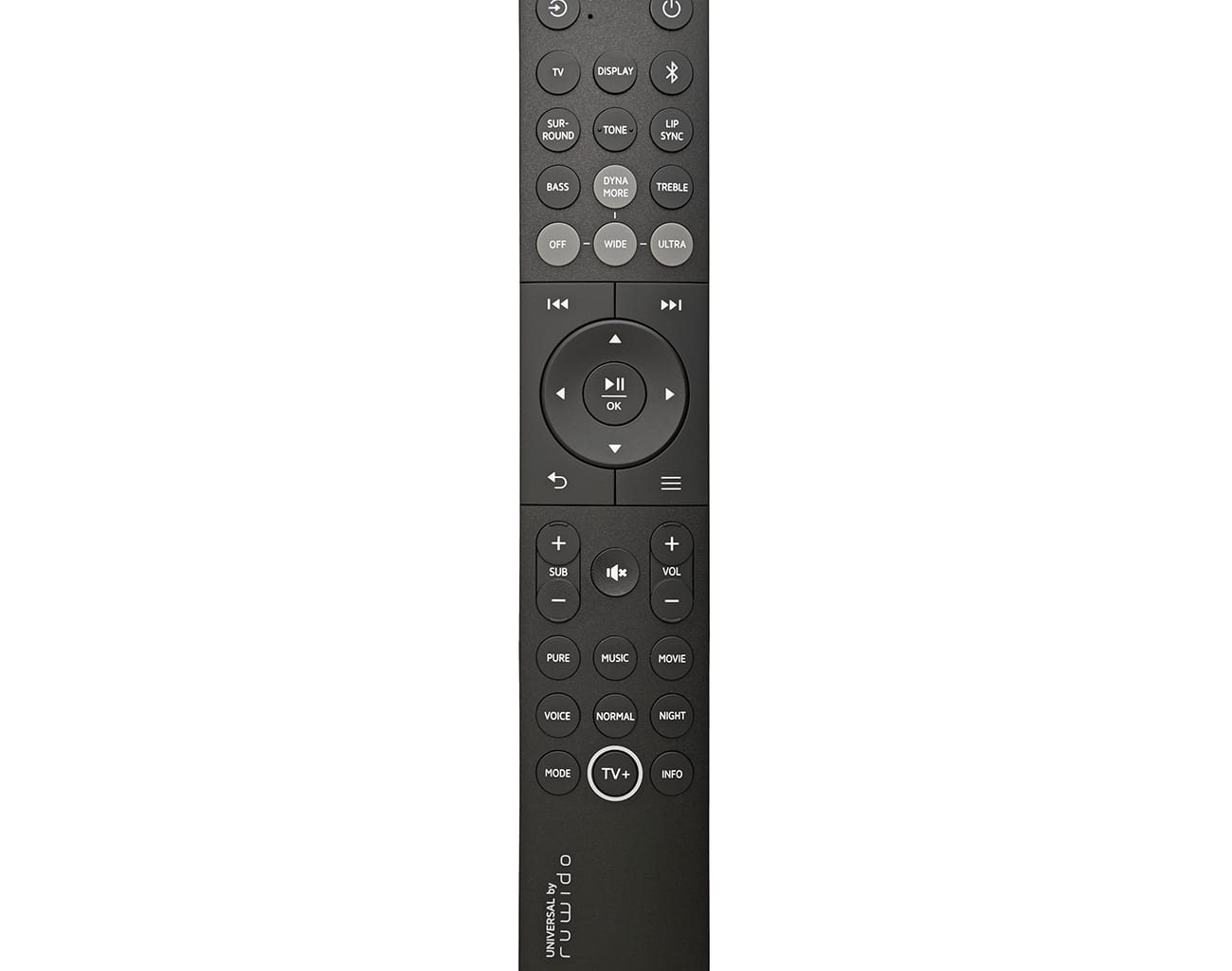 - High-quality, elegant infrared universal remote control by ruwido with Bluetooth and app option. Developed and produced exclusively for Teufel soundbars in Austria.