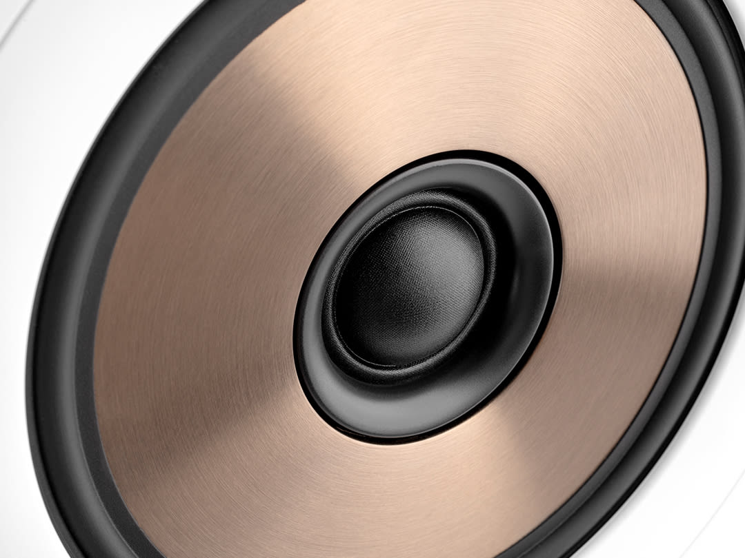 Large tweeters supply silky trebles even at high volumes. The tweeter and midrange driver are fused into a single component, meaning all frequencies they handle reach the ear at almost the exact same time, which makes playback sound particularly authentic and natural. Three woofers made of kevlar and shaped like woks for light weight and low flow noise as well as extreme excursion, bringing deep, precise bass.